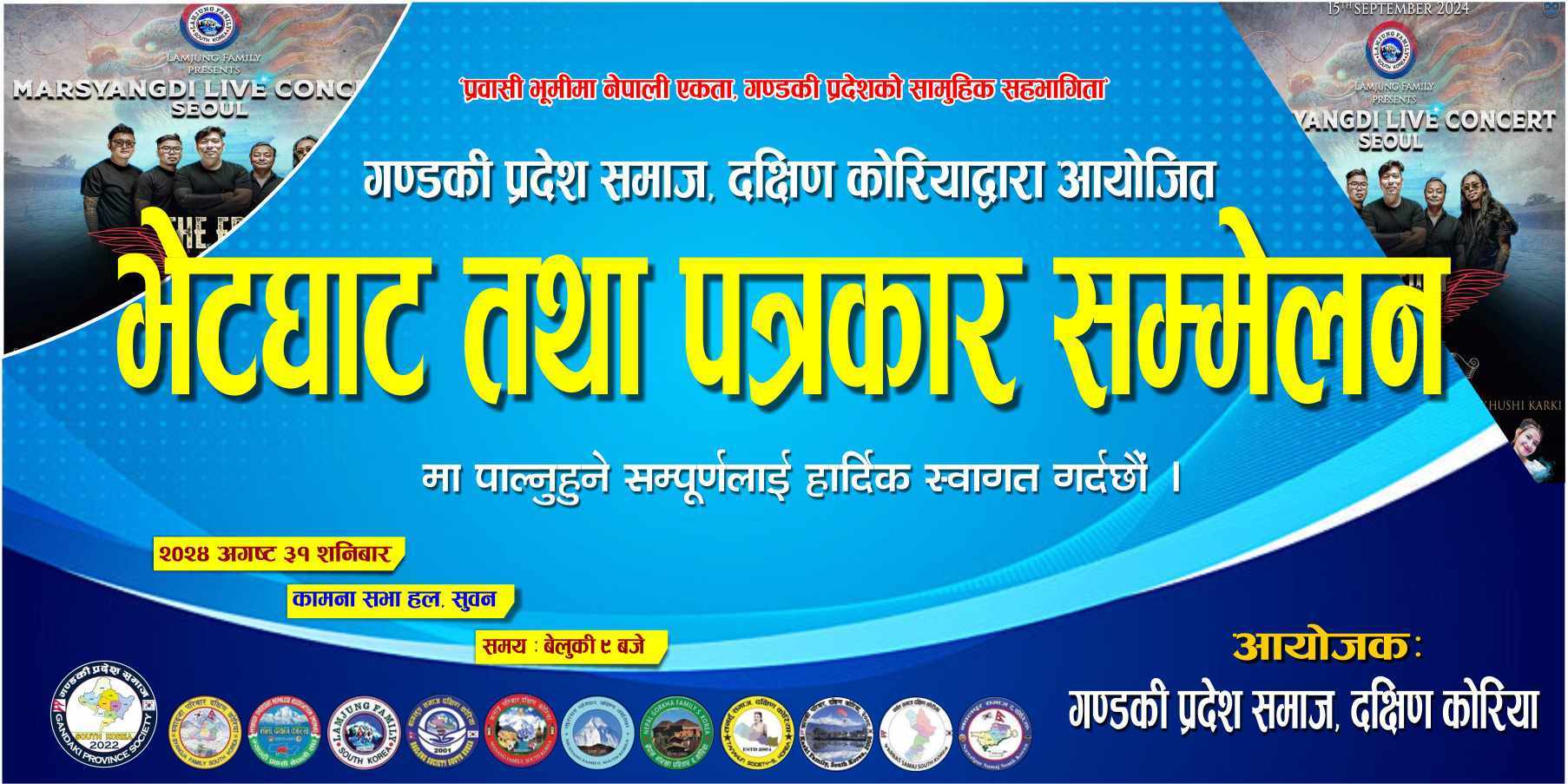 कार्यक्रमलाई भब्य र सभ्य रुपमा सम्पन्न गर्नका लागि गण्डकी प्रदेश समाज दक्षिण कोरियाले भेटघाट तथा पत्रकार सम्मेलनको आयोजना गरेको जनाएको छ ।