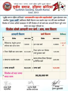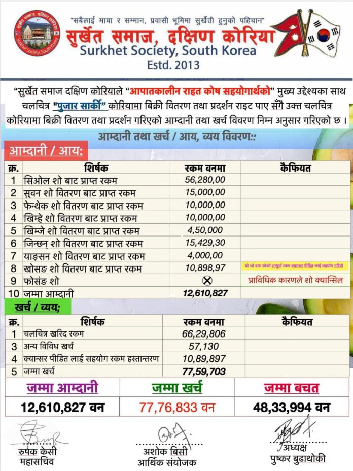 “आपतकालीन राहतकोष सहयोगार्थ’’ सुर्खेत समाज दक्षिण कोरियाले प्रदर्शन गरेको नेपाली कथानाक चलचित्र पुजार सार्कीको आयब्यय सार्वजनिक गरिएको छ ।