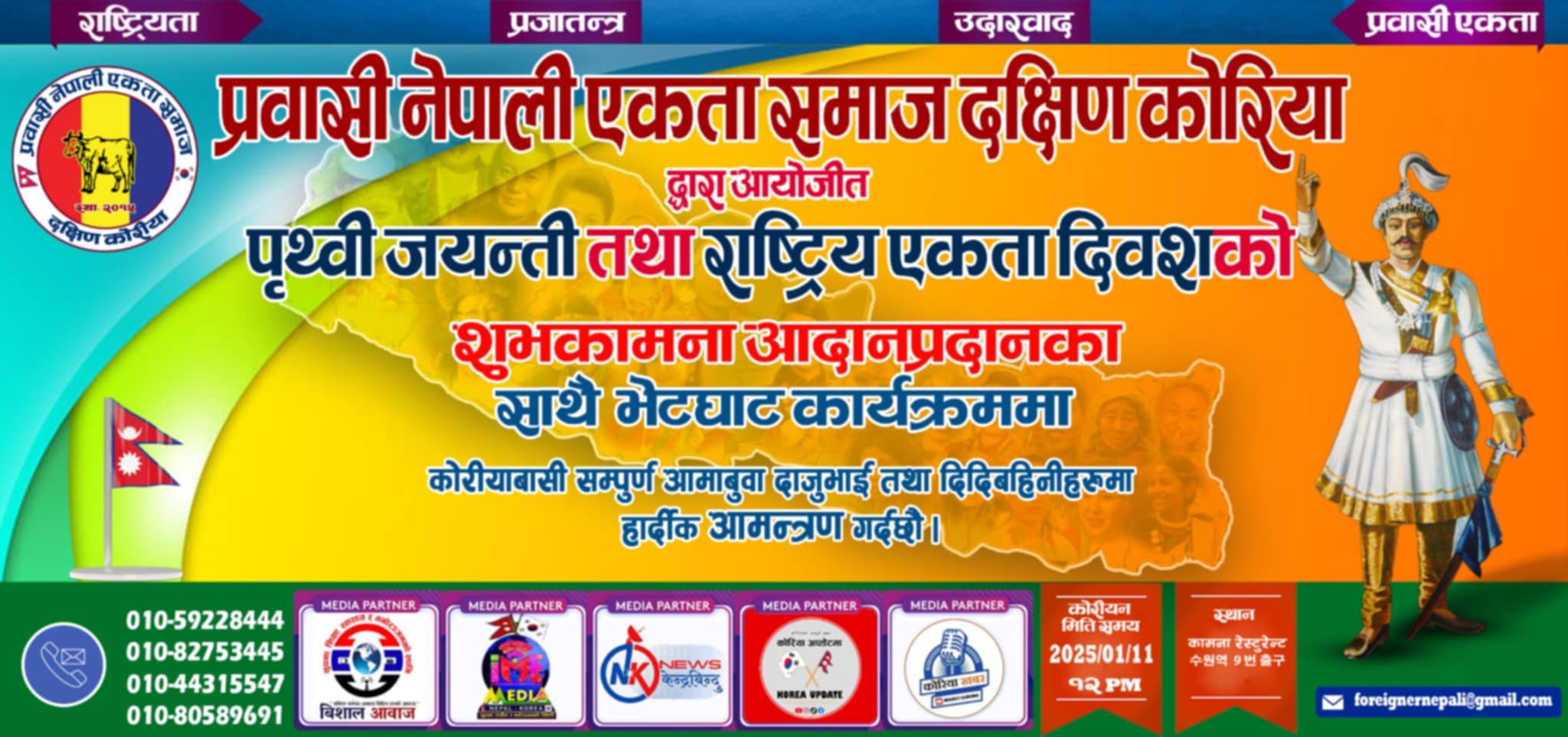 प्रवासी नेपाली एकता समाज दक्षिण कोरियाले मुलुक एकीकरणका नायक पृथ्वीनारायण शाहको जन्मजयन्ती तथा राष्ट्रिय एकता दिवस भब्य रुपमा मनाउने भएको छ ।