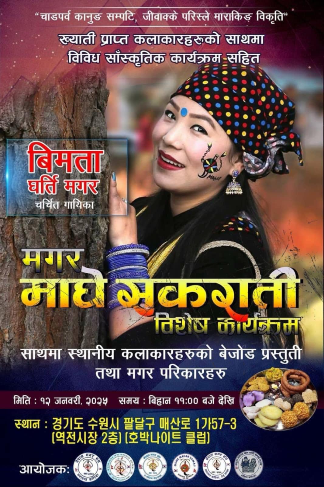 “चाडपर्व कानुङ सम्पटि, जिवाक्के परिस्ले माराकिङ विकृति” भन्ने मूल उद्देश्यलाई आत्मसात गर्दै नेपाल मगर संघ दक्षिण कोरिया (किम्हे/बुसान शाखा, थेगु शाखा, जेजु शाखा, डिएसएमइ मगर समाज गजेदो, र अठार मगरात खामभाषी सम्पर्क मञ्च) को संयुक्त आयोजनामा मगर समुदायको पर्व माघे सक्रान्ति विशेष कार्यक्रम-२०८१ भब्य रुपमा मनाउने गरी तयारी थालिएको छ ।
