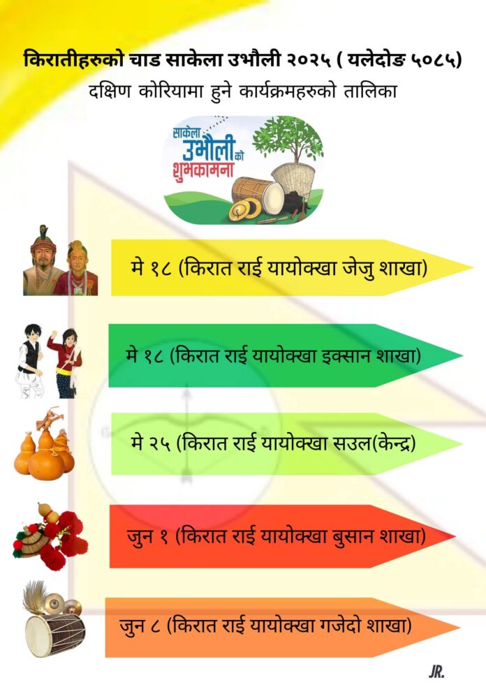 मे १८ तारिक किरात राई यायोक्खा जेजुदो र इक्सान शाखाले साकेला उभौली आयोजना गर्ने कार्यक्रम रहेको छ । त्यस्तै गरी मे २५ मा किरात राई यायोक्खा सउल केन्द्र, जुन १ मा किरात राई यायोक्खा बुसान शाखा र जुन ८ मा किरात राई यायोक्खा गजेदोमा आयोजना हुन गइरहेको छ ।