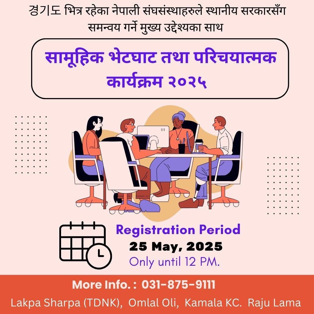 यस कार्यक्रममा सहभागी हुन चाहने 경기도मा क्रियाशील नेपाली संघसंस्थाहरूलाई Google Form मार्फत नाम दर्ता गर्न आयोजकले अनुरोध गरेका छन्।