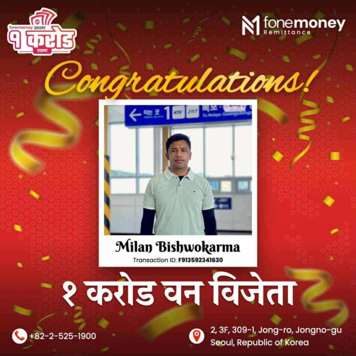 दक्षिण कोरिया – जुन १६, २०२५ रेमिट्यान्स सेवा प्रदायक Fonemoney द्वारा सञ्चालन गरिएको “फोनमनी साथमा १ करोड हातमा” योजना अन्तर्गत १ करोड कोरियन वन जित्ने भाग्यशाली विजेता मिलन बिश्वकर्मा घोषित भएका छन्। यो विजेता छनोट कार्यक्रम जुन १५, २०२५ गते आइतबार, दोंगदेमुनस्थित Fonemoney को मुख्य कार्यालयमा लक्की ड्र मार्फत सम्पन्न गरिएको थियो।