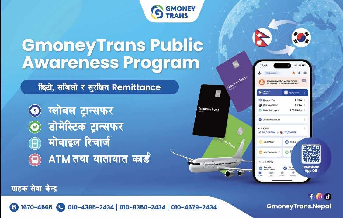 दक्षिण कोरिया — कोरियामा कार्यरत नेपाली समुदायलाई लक्षित गर्दै GmoneyTrans ले सार्वजनिक जनचेतनामूलक कार्यक्रम संचालनमा ल्याएको छ। ‘छिटो, सजिलो र सुरक्षित रेमिटेन्स सेवा’ भन्ने नारासहित सुरु गरिएको यस कार्यक्रममार्फत प्रवासी नेपालीहरूलाई आवश्यक वित्तीय सेवा सरल र भरपर्दो माध्यमबाट उपलब्ध गराउने लक्ष्य लिइएको छ।