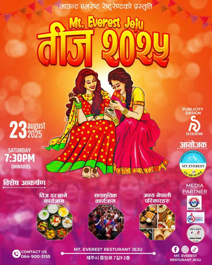 नेपाली महिलाहरूको महान् चाड हरितालिका तिजको अवसरमा दक्षिण कोरियाको जेजुस्थित माउन्ट एभरेष्ट रेस्टुरेन्टले तिज २०२५ को विशेष कार्यक्रम आयोजना गर्ने भएको छ। यो कार्यक्रम आगामी अगस्ट २३ तारिख शनिवार साँझ ७:३० बजेदेखि सुरु हुनेछ।