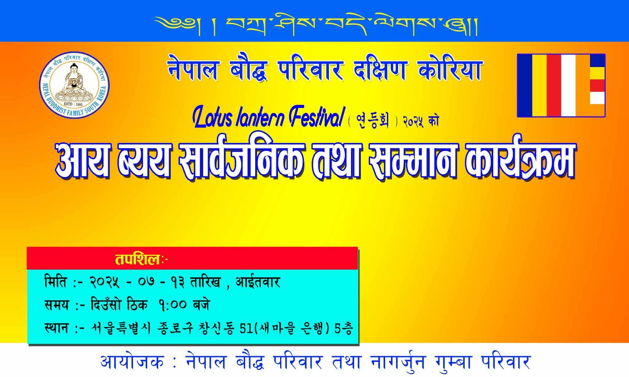 दक्षिण कोरियाको राजधानी सउलमा सम्पन्न भएको बौद्ध धर्मगुरु भगवान गौतम बुद्धको २५६९ औं जन्म जयन्ती तथा Lotus Lantern Festival 2025 कार्यक्रमको आय–व्यय सार्वजनिक गरिने भएको छ।