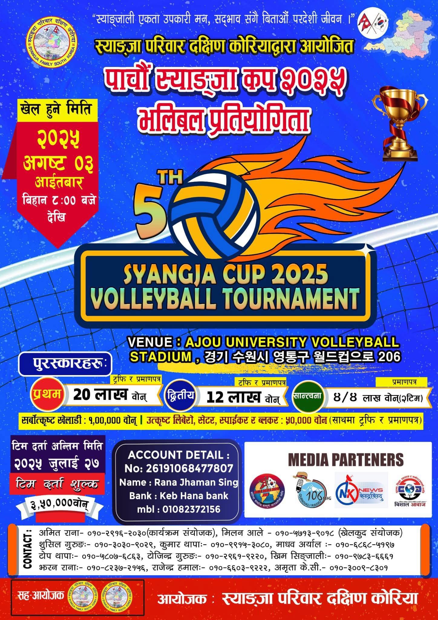 १४ जूलाई २०२५, कोरिया कोरियामा अति सक्रिय संस्था स्याङ्जा परिवार दक्षिण कोरियाले “पाँचौं स्याङ्जा कप २०२५” भलिबल प्रतियोगिता गर्ने भएको छ । भलिबल प्रतियोगिताको साझा संस्था नेपाल कोरिया भलिबल संघको मातहतमा रहेर यस उक्त संघकै अनुमति बमोजिम यही आउँदो अगष्ट ३ तारिक सुवनस्थित AJOU UNIVERSITY VOLLEYBALL STADIUM [경기 수원시 영통구 월드컵으로 206] मा उक्त प्रतियोगिता आयोजना गरिने संस्थाका अध्यक्ष सुशील गुरुङले जानकारी दिए ।