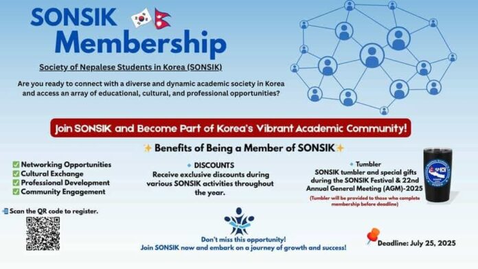 कोरियामा उच्च शिक्षाका लागि आएका नेपाली विद्यार्थीहरूलाई लक्षित गर्दै Society of Nepalese Students in Korea (SONSIK) ले २०२५ का लागि आफ्नो वार्षिक सदस्यता दर्ता खुला गरेको छ। यस संस्थाले कोरियामा अध्ययनरत सम्पूर्ण नेपाली विद्यार्थीहरूलाई एकीकृत गर्दै उनीहरूको शैक्षिक, सामाजिक, र सांस्कृतिक जीवनमा सकारात्मक प्रभाव पार्ने लक्ष्य लिएको छ। SONSIK का अनुसार, यस वर्ष पनि सदस्य बनेका विद्यार्थीहरूले विभिन्न विशेष सेवा र सुविधाहरू प्राप्त गर्नेछन्।