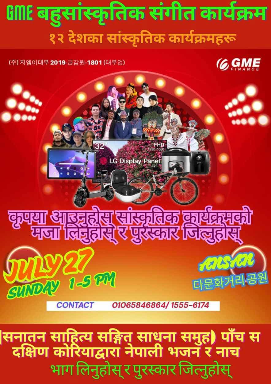 कोरियामा रहेका विभिन्न देशका सांस्कृतिक प्रस्तुतिहरूलाई एकै मञ्चमा प्रस्तुत गर्ने उद्देश्यले GME बहुसांस्कृतिक संगीत कार्यक्रम यही जुलाई २७ तारिख, आईतवार, दिउँसो १ देखि ५ बजेसम्म आयोजना हुने भएको छ। कार्यक्रम Ansan शहरस्थित 다문화거리공원 (Multicultural Street Park) मा हुने जनाइएको छ।