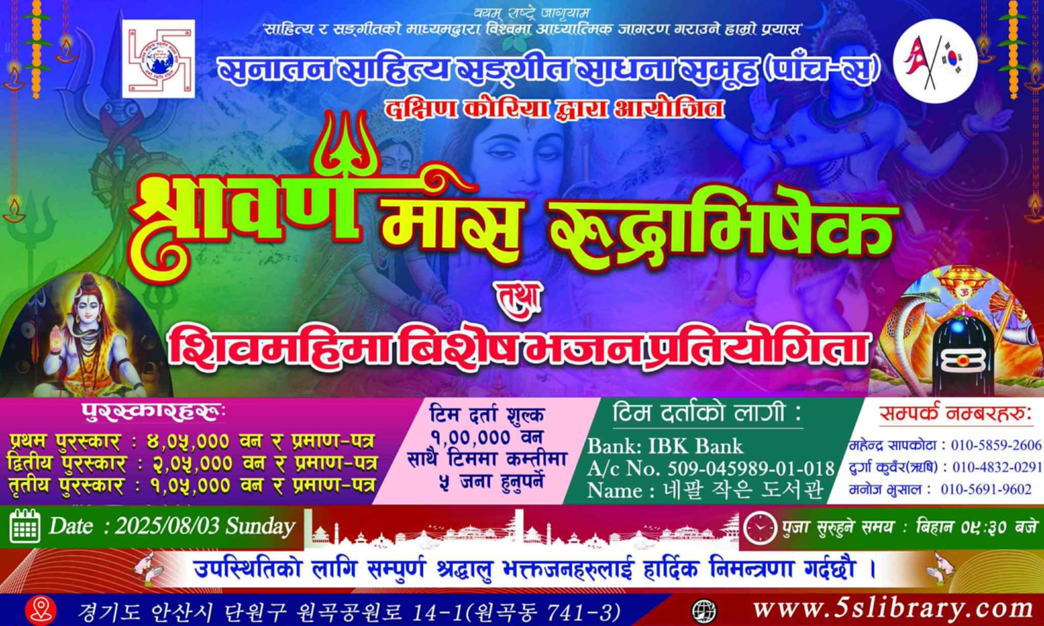 दक्षिण कोरिया – नेपाली मौलिक संस्कार, संस्कृति तथा सनातन परम्पराको संरक्षण, सम्वर्धन र प्रवर्द्धन गर्ने उद्देश्यले सनातन, साहित्य, सङ्गीत, साधना समूह (पाँच स) दक्षिण कोरियाले पवित्र श्रावण महिनाको अवसरमा विशेष धार्मिक कार्यक्रमको आयोजना गर्न लागेको छ।