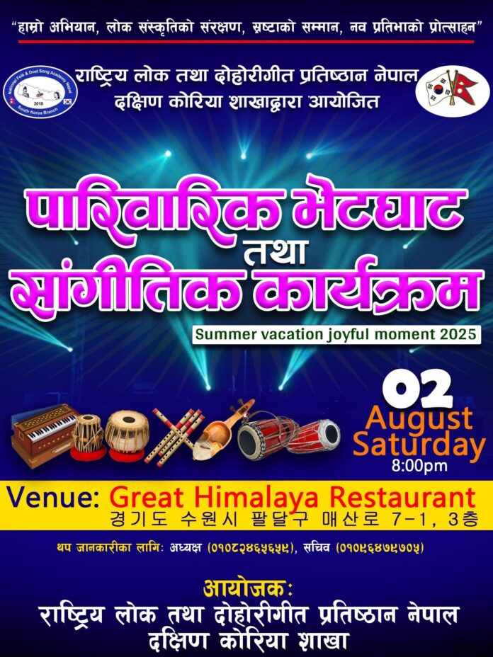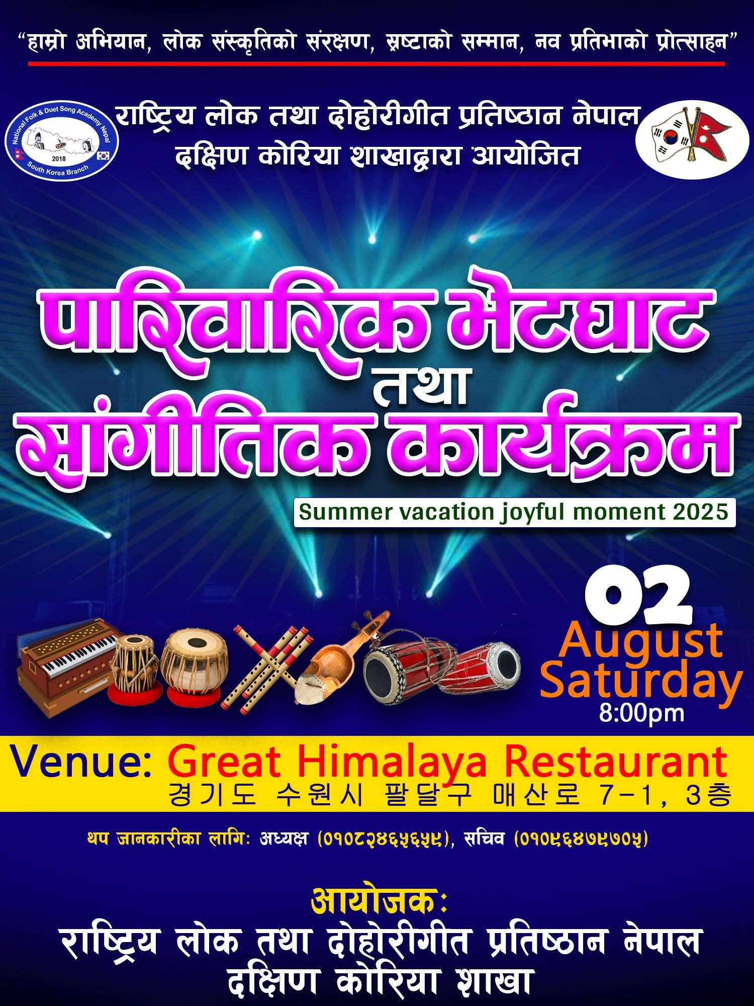 गर्मी बिदाको रमाइलो अवसरलाई लक्षित गर्दै “Summer Vacation Joyful Moment 2025” शीर्षकमा आयोजना गरिन लागेको यो विशेष कार्यक्रम आउँदो अगस्ट २ तारिख, शनिबार बेलुकी ८ बजेबाट सुरू हुनेछ। कार्यक्रमको स्थान भने Great Himalaya Restaurant, 경기도 수원시 팔달구 매산로 7-1, 3층 मा तोकिएको छ।