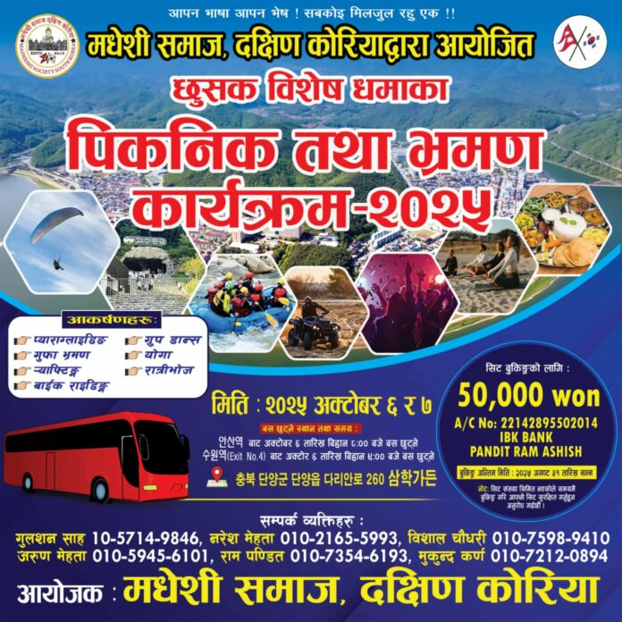 कोरियामा रहेका नेपालीहरूबीच आपसी मेलमिलाप, एकता र सांस्कृतिक सञ्जाललाई अझ मजबुत बनाउने उद्देश्यले मधेशी समाज दक्षिण कोरियाले दुई दिन एक रातको विशेष पिकनिक तथा भ्रमण कार्यक्रमको आयोजना गर्ने भएको छ।