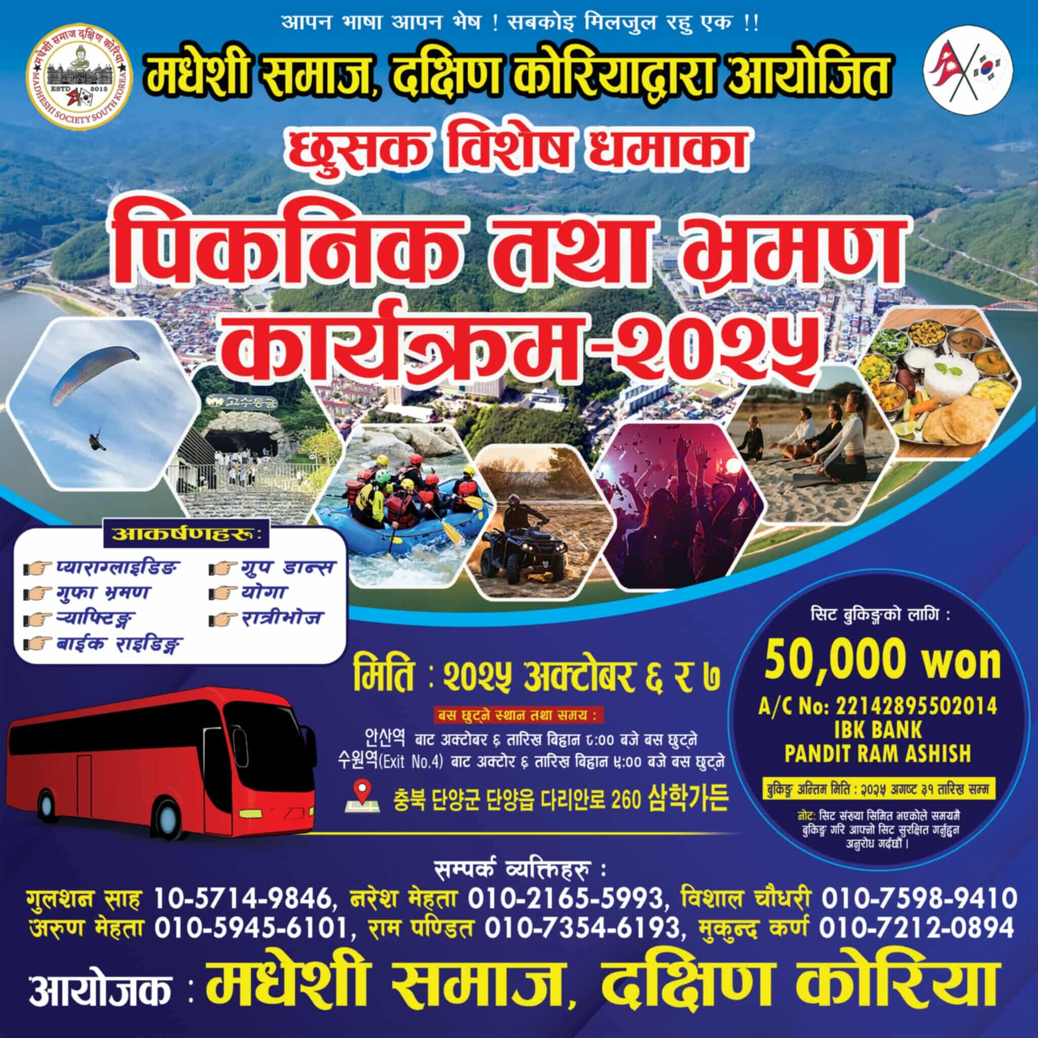 यो कार्यक्रम २०२५ अक्टोबर ६ देखि ७ तारिखसम्म दक्षिण कोरियाको प्रसिद्ध प्राकृतिक गन्तव्य स्थल थान्याङ (단양), 충청북도मा हुने निश्चित भएको छ। कार्यक्रममा प्याराग्लाइडिङ, गुफा अवलोकन, र्याफ्टिङ, बाइक राइडिङ, ग्रुप डान्स, योगा, रात्रि भोज लगायतका विविध रोमाञ्चक र मनोरञ्जनात्मक गतिविधिहरू समावेश गरिनेछ।