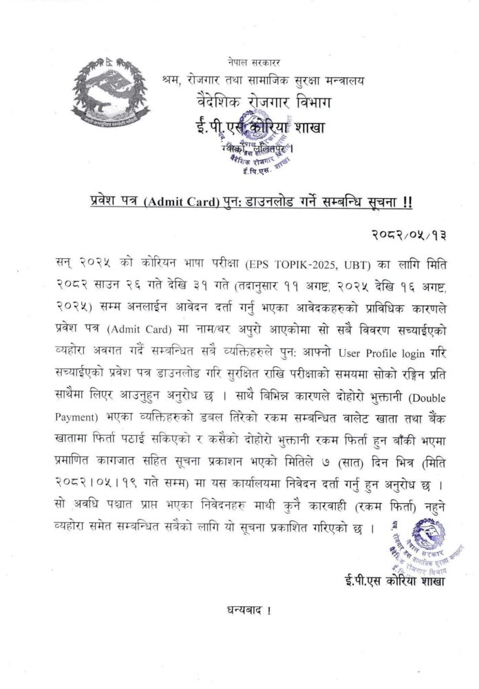 नेपाल सरकार, श्रम, रोजगार तथा सामाजिक सुरक्षा मन्त्रालयअन्तर्गतको ईपीएस कोरिया शाखाले सन् २०२५ का लागि हुने कोरियन भाषा परीक्षा (EPS–TOPIK, UBT) सम्बन्धी नयाँ सूचना प्रकाशित गरेको छ।