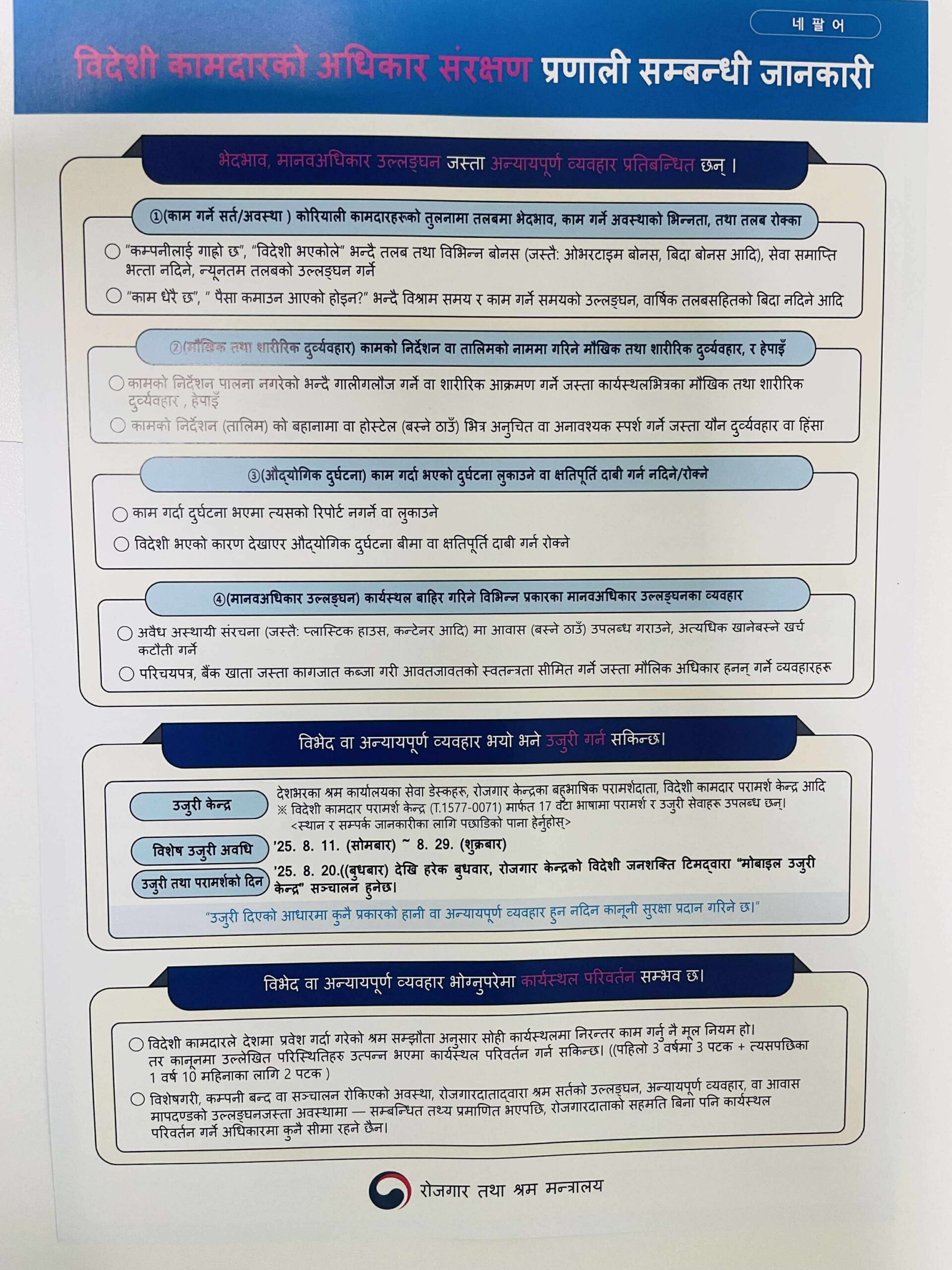 कोरियामा कार्यरत विदेशी कामदारका लागि भेदभाव, दुर्व्यवहार, मानव अधिकार उल्लङ्घन विरुद्ध सरकारी निगरानी, बहुभाषिक परामर्श, फील्ड–रिपोर्टिङ, र उजुरी/मध्यस्थता प्रणाली सक्रिय छ। विदेशी कामदारहरूले आफ्नो अधिकार सुरक्षित राख्न सबै उपलब्ध केन्द्रहरू प्रयोग गर्न र प्रमाण संकलन गरी उजुरी दर्ता गर्न सल्लाह दिइएको छ।