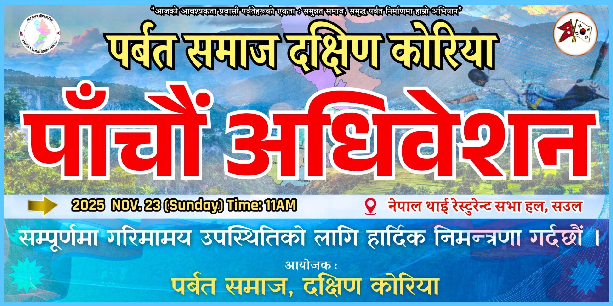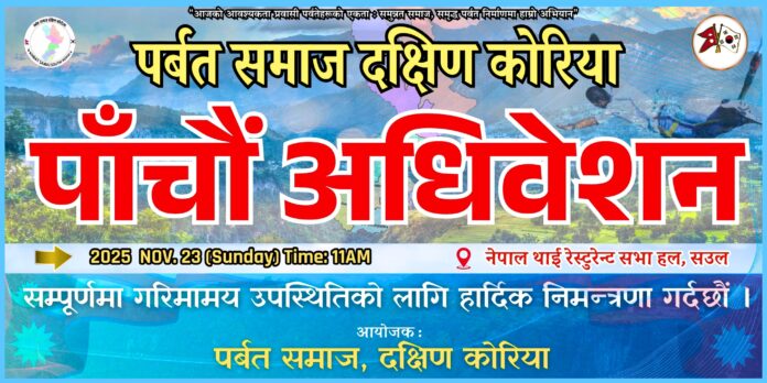 आयोजक: पर्वत समाज, दक्षिण कोरिया मिति: २०२५ नोभेम्बर २३ (आइतबार) समय: बिहान ११ बजे स्थान: नेपाल थाई रेस्टुरेन्ट सभा हल, सउल