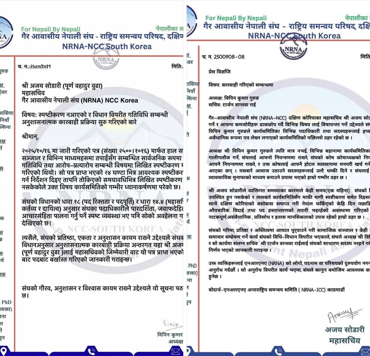 दुवै पक्षका विज्ञप्तिहरू सार्वजनिक भएपछि एनआरएनए दक्षिण कोरियाको वर्तमान नेतृत्वभित्र मतभेद खुलेर सतहमा आएको छ।