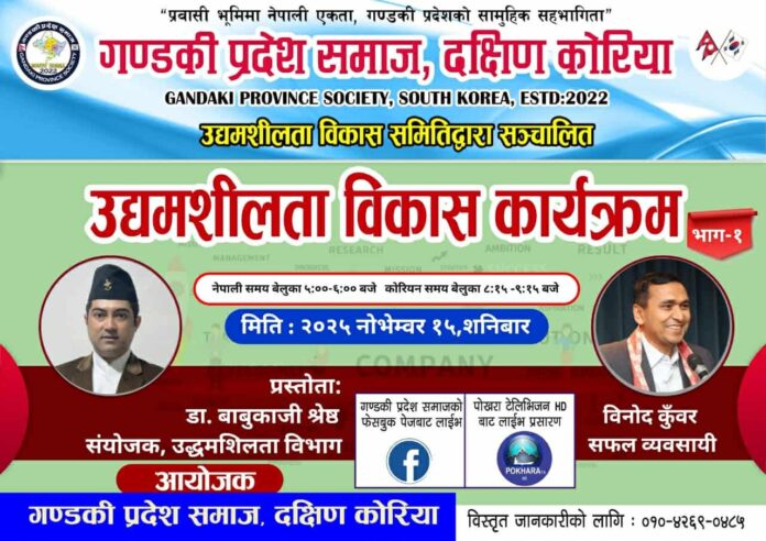 गण्डकी प्रदेश समाज, दक्षिण कोरियाले प्रवासी नेपालीहरूलाई “रोजगारी मात्र होइन, स्वदेशमा रोजगारी सिर्जना गर्ने उद्यमी बनौँ” भन्ने सन्देशसहित उद्यमशीलताको अभियानलाई निरन्तर अघि बढाउँदै लैजाने प्रतिबद्धता जनाएको छ।