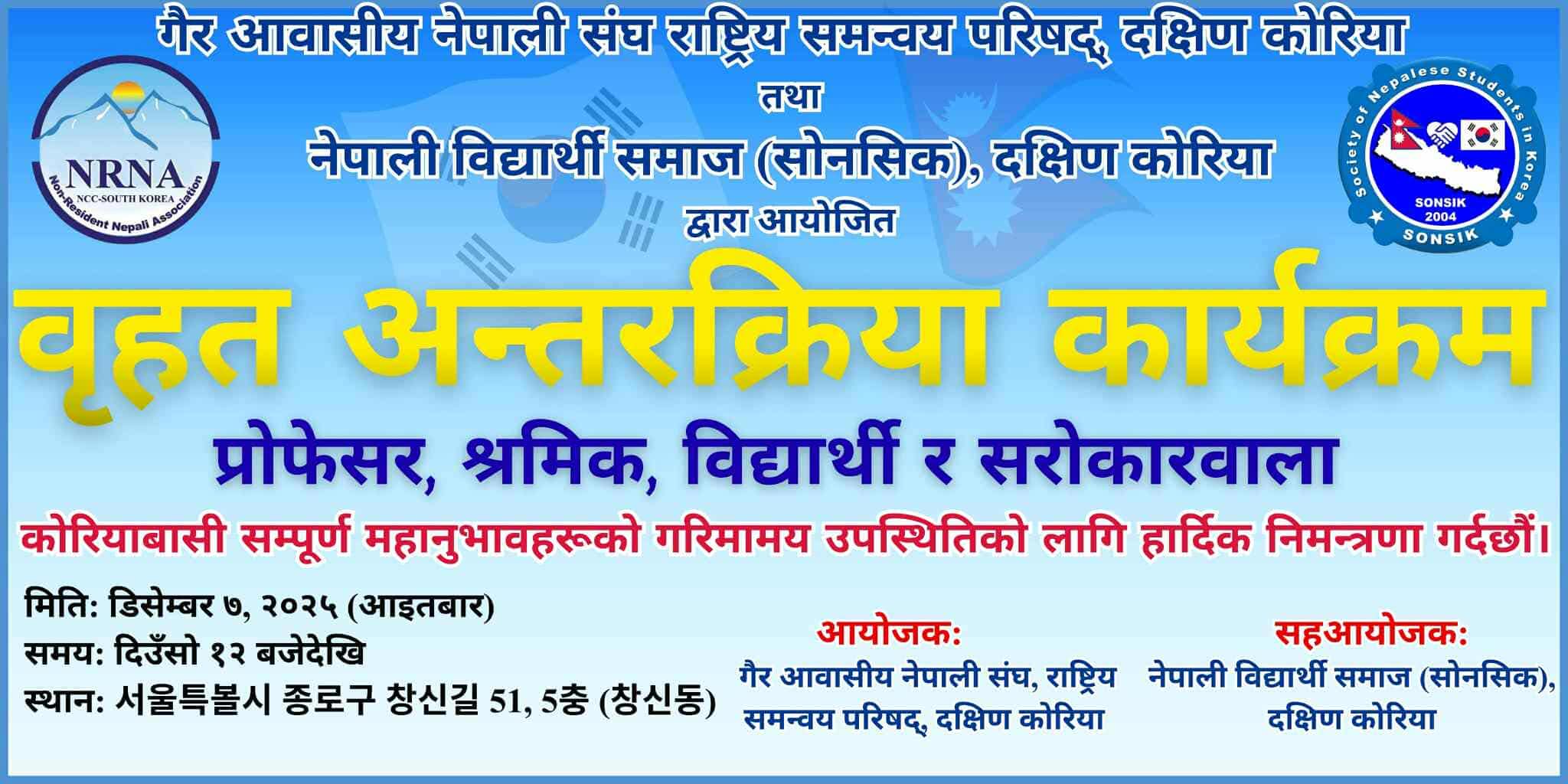 सियोल। कोरियामा बसोबास गर्ने नेपाली समुदायका लागि गैर आवासीय नेपाली संघ, राष्ट्रिय समन्वय परिषद्–दक्षिण कोरिया र नेपाली विद्यार्थी समाज (SONSIK), दक्षिण कोरियाले संयुक्त रूपमा ‘वृहत अन्तरक्रिया कार्यक्रम’ आयोजना गर्ने भएका छन्।
