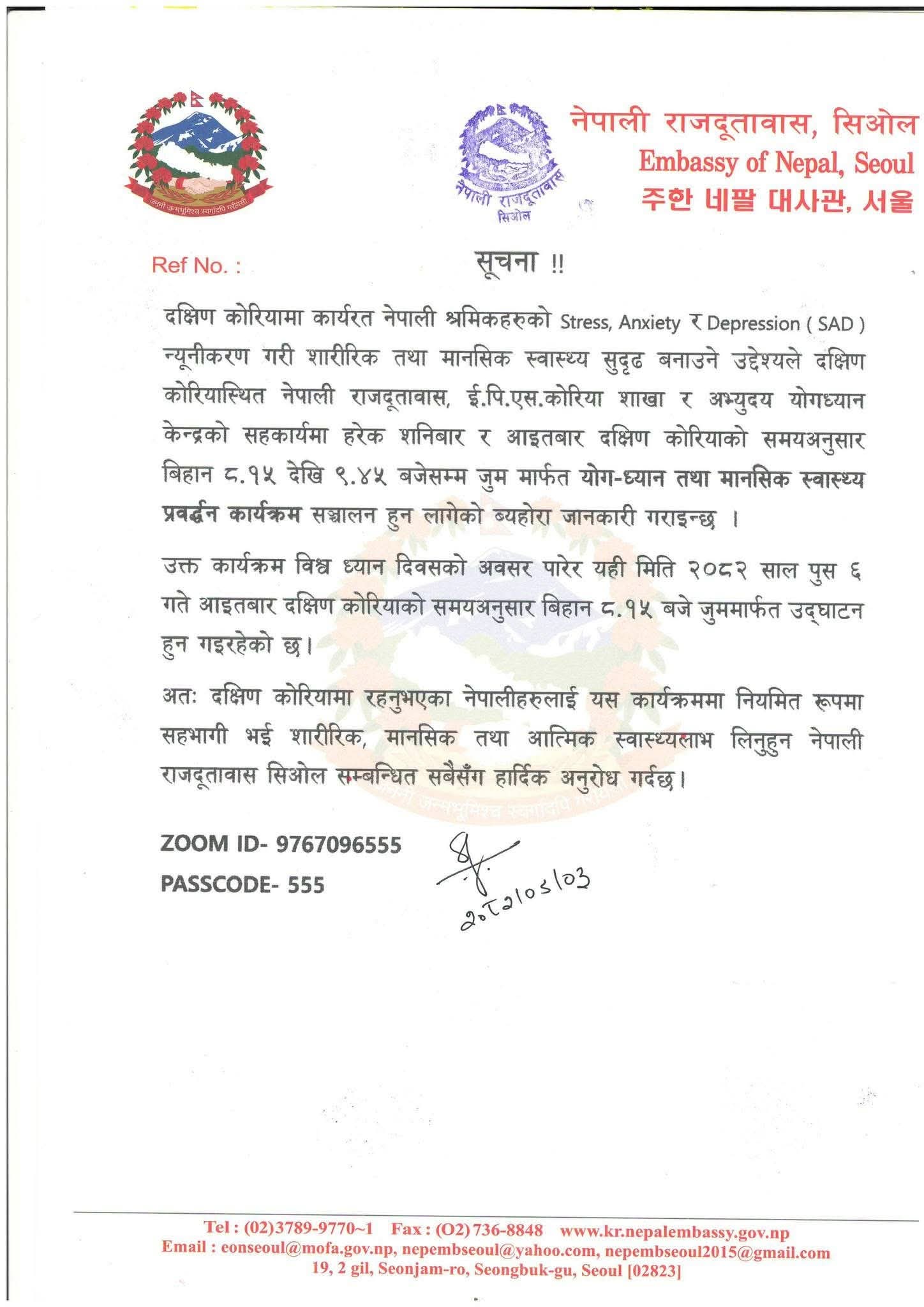 राजदूतावासले दक्षिण कोरियामा रहनु भएका सबै नेपालीहरूलाई यस कार्यक्रममा नियमित रूपमा सहभागी भई शारीरिक, मानसिक तथा आत्मिक स्वास्थ्य लाभ लिन हार्दिक अनुरोध गरेको छ।