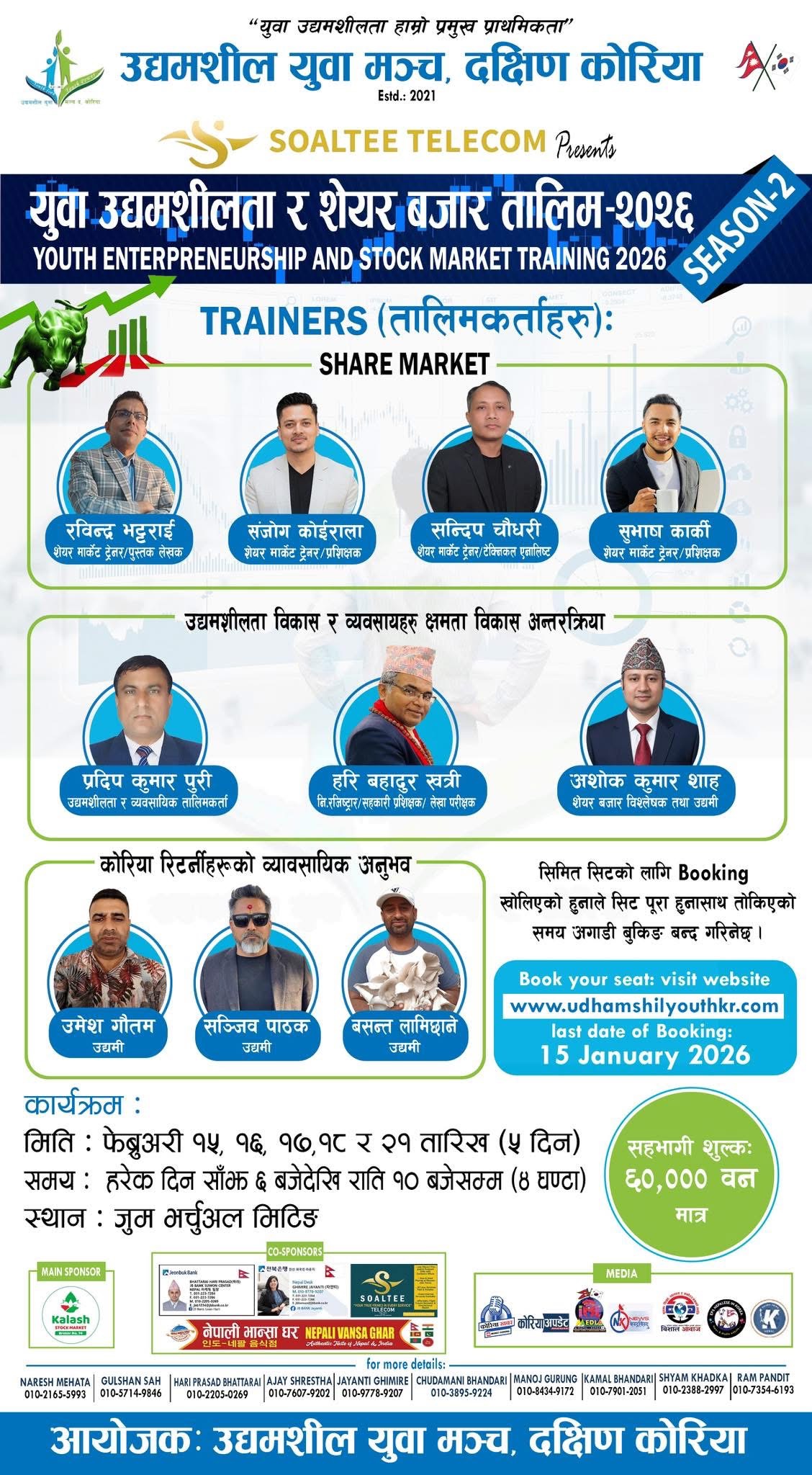 दक्षिण कोरिया — कोरियन पर्व सलनाल को शुभ अवसरमा उद्यमशील युवा मञ्च, दक्षिण कोरिया को आयोजनामा युवा उद्यमशीलता तथा सेयर बजार तालिम–२०२६ सञ्चालन हुने भएको छ। युवाहरूलाई उद्यमशीलता र सेयर बजारसम्बन्धी व्यवहारिक ज्ञान प्रदान गर्ने उद्देश्यले उक्त तालिम आयोजना गरिएको आयोजक संस्थाले जनाएको छ।