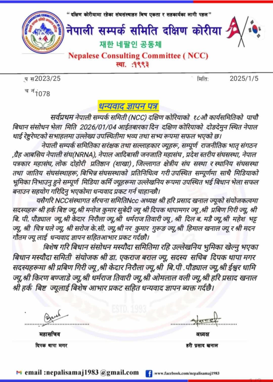 सोल, दक्षिण कोरिया नेपाली सम्पर्क समिति (NCC) दक्षिण कोरियाको १८औँ कार्यसमितिद्वारा आयोजित पाँचौँ विधान संशोधन भेला सफलतापूर्वक सम्पन्न भएको छ।