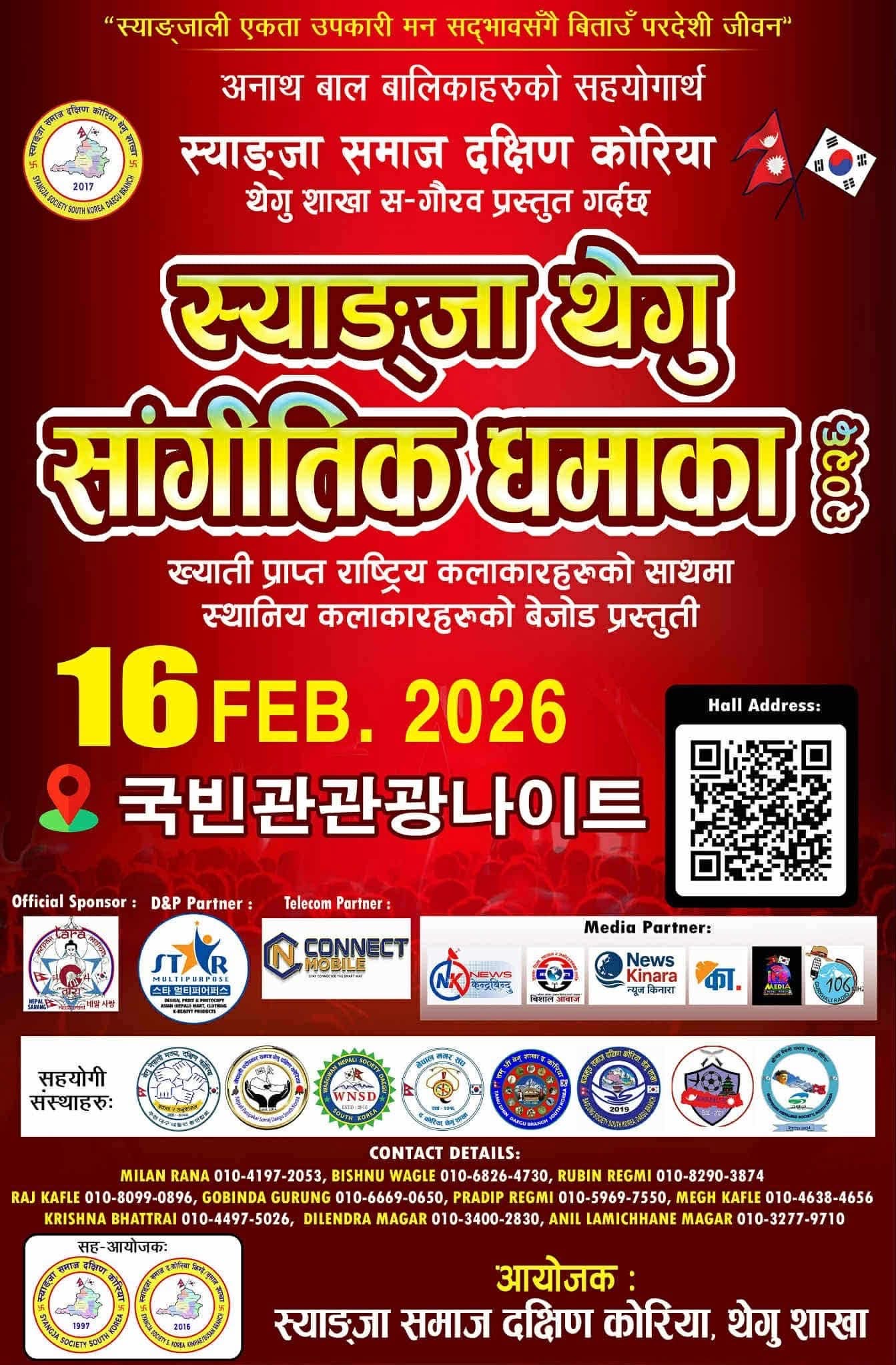 दक्षिण कोरियामा रहेका स्याङ्जाली नेपालीहरूको साझा संस्था स्याङ्जा समाज दक्षिण कोरिया, थेगु शाखाको आयोजनामा अनाथ बालबालिकाको सहयोगार्थ भव्य सांगीतिक कार्यक्रम “स्याङ्जा थेगु सांगीतिक धमाका” आयोजना हुने भएको छ।