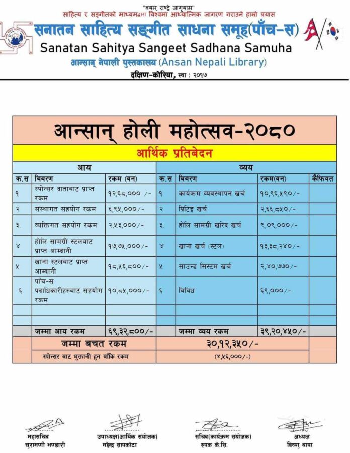 दक्षिण कोरियामा सक्रिय नेपालीहरूको साझा संस्था सनातन साहित्य संगीत साधना समूह पाँच “स” ले आयोजना गरेको होली महोत्सवको आयब्यय सार्वजनि गरिएको छ ।