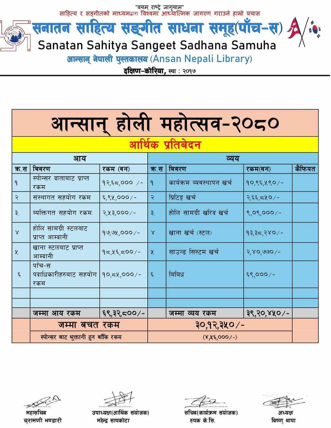 गत मार्च २४ तारिखमा सम्पन्न आनसान होली महोत्सवमा भएको आम्दानी र खर्चको विवरण सार्वजनिक गरिएको हो ।