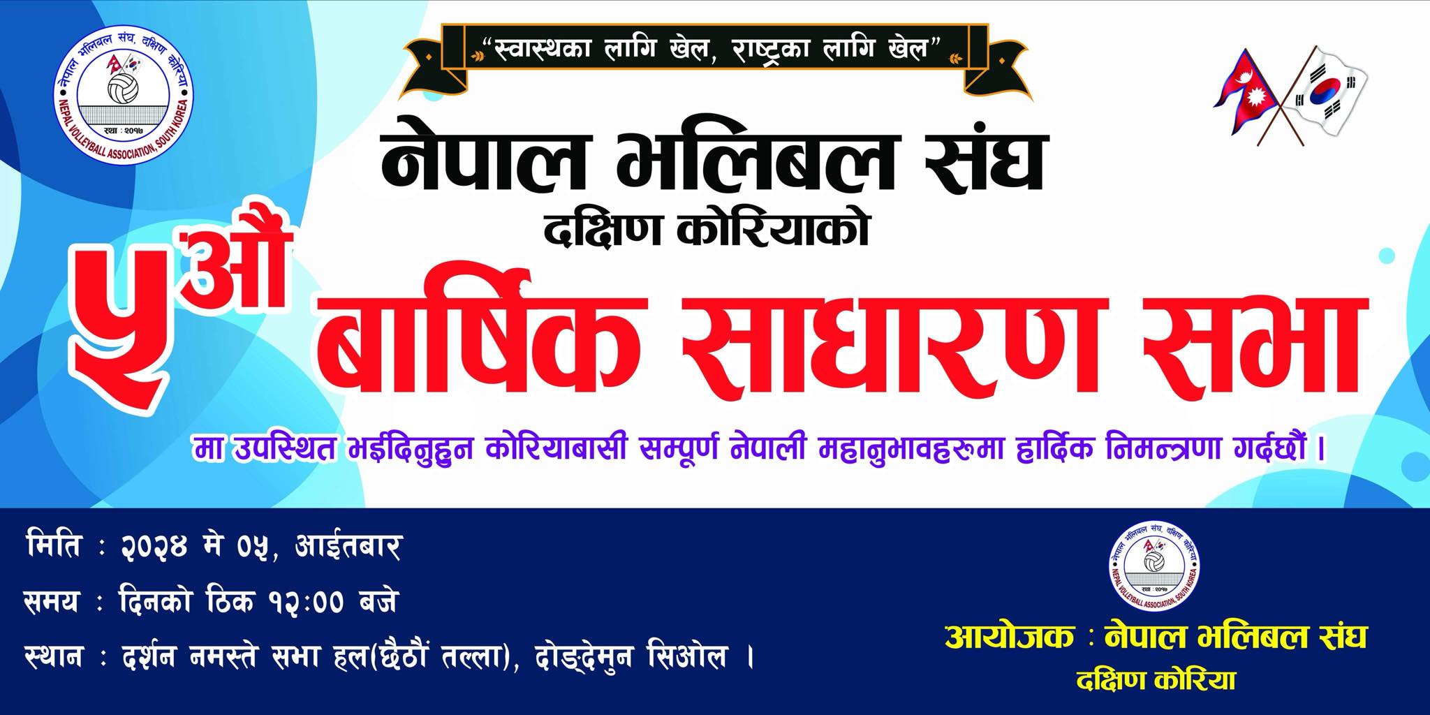 नेपाल भलिबल संघ दक्षिण कोरियाको पाँचौ बार्षिक साधारण सभा आगामी मे ५ तारिखमा हुने भएको छ । संघको हालै सम्पन्न बैठकले मे ५ मा साधारण सभा गर्ने निणर्य गरेको हो ।